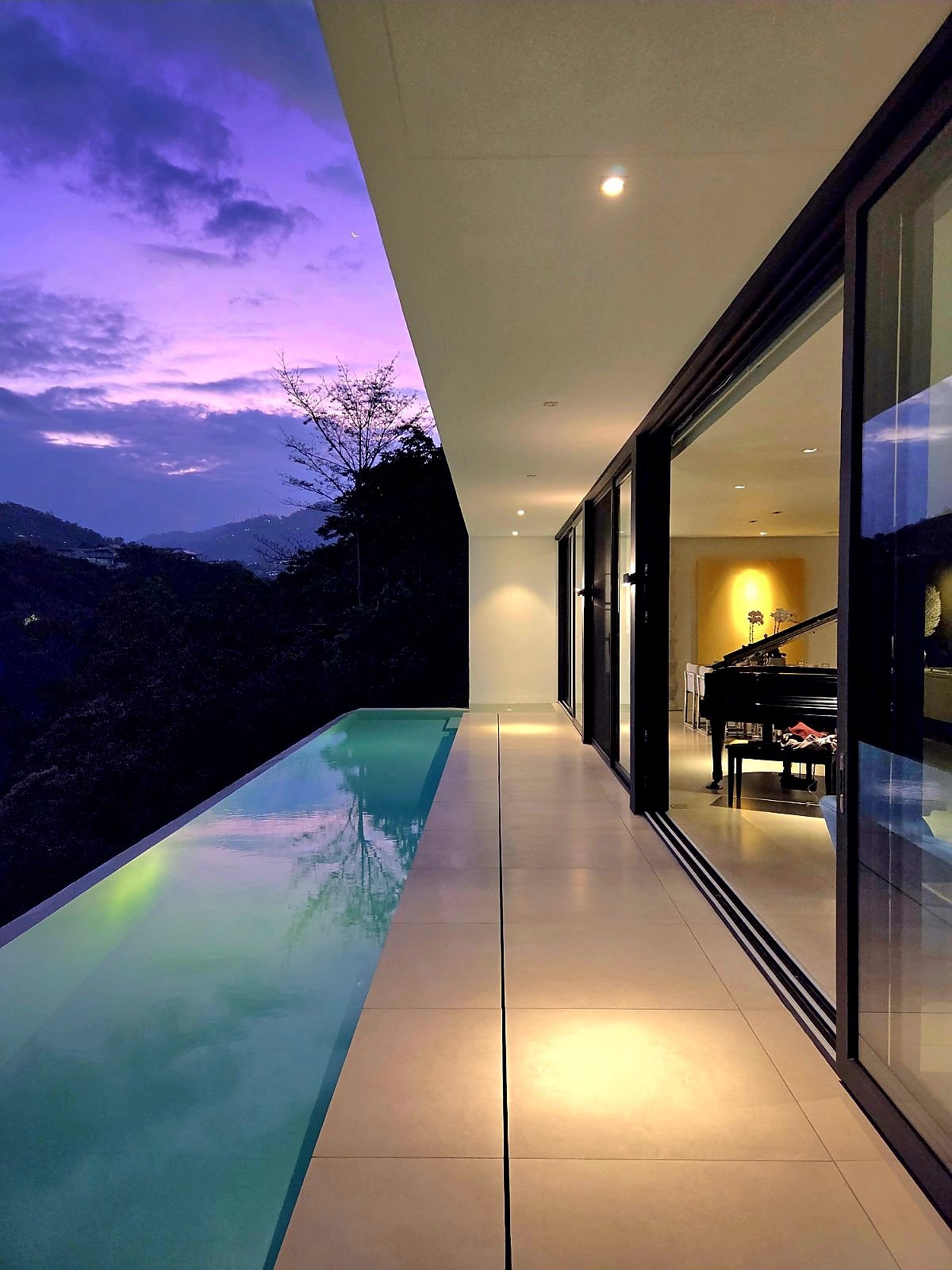 As a result, the house features clean lines, a carefully balanced composition, and exposed building materials, along with spacious rooms and abundant natural light. The style emphasizes volume and perspective, further enhanced by a minimalist outlook.