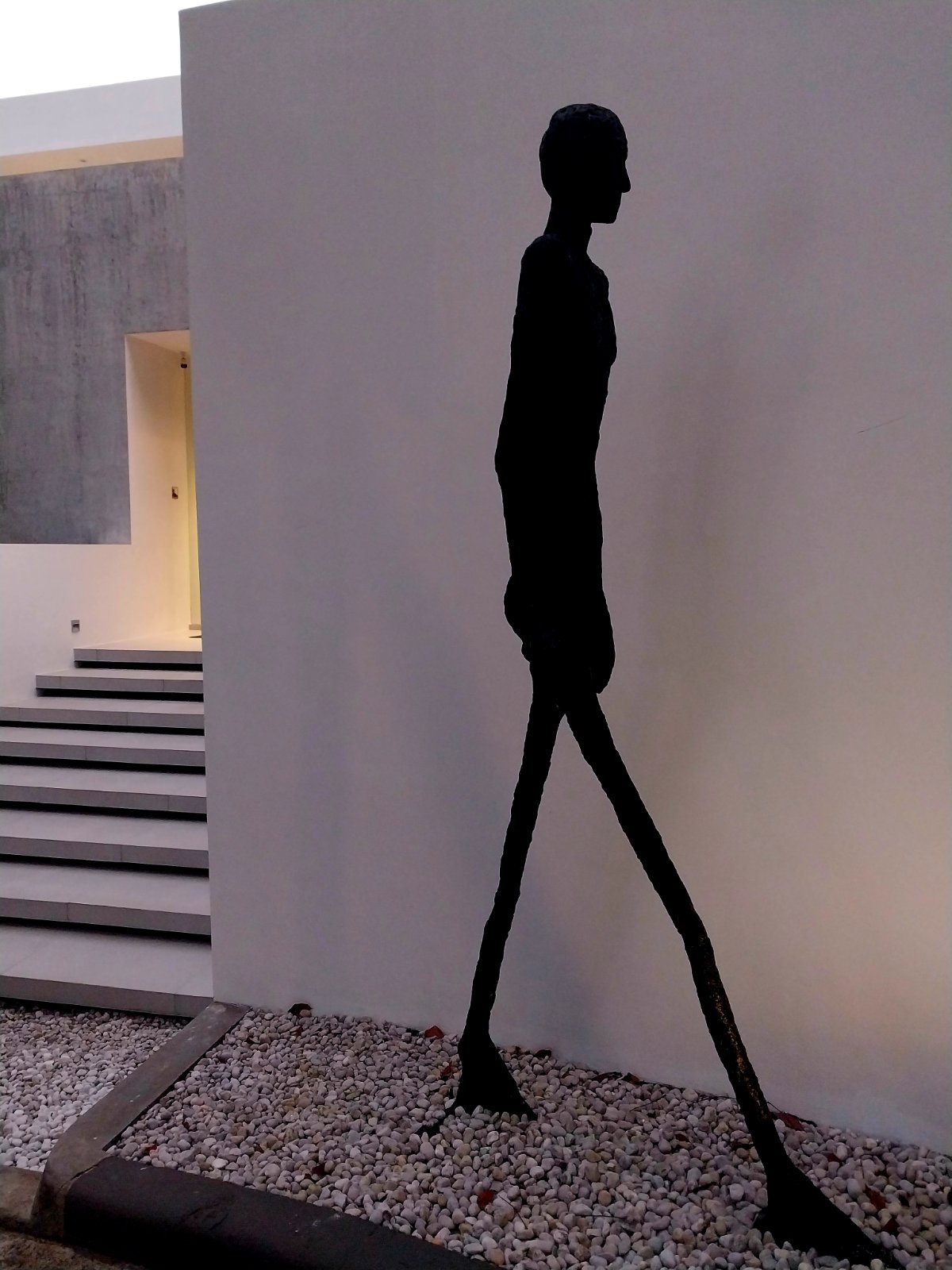 A Brancusi like sculpture against a polished concrete wall offers a low key entrance to the property.