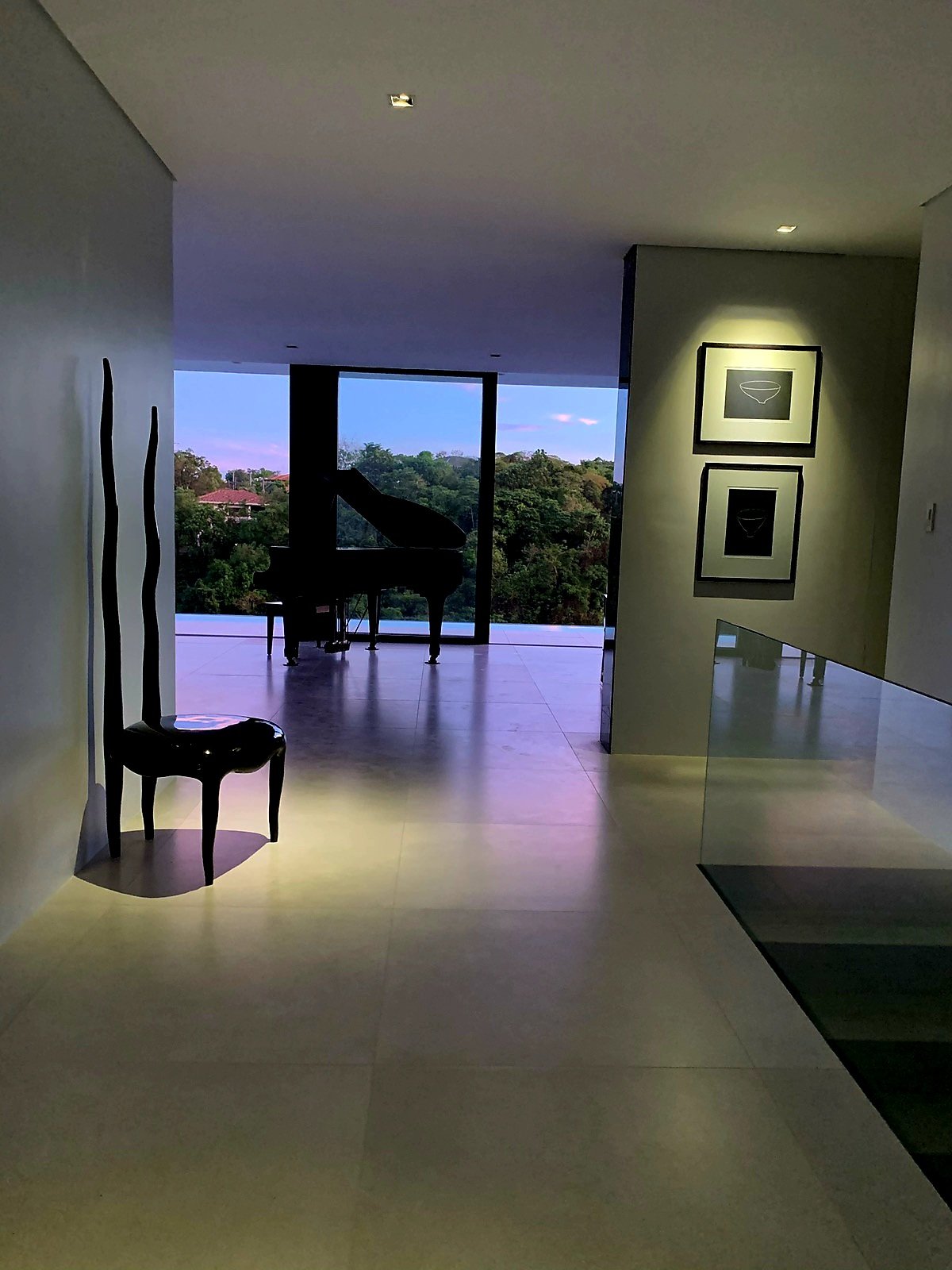 R&Y Agousti Sylvie chair and a black baby grand Wienstein piano define the space of the house’s entrance