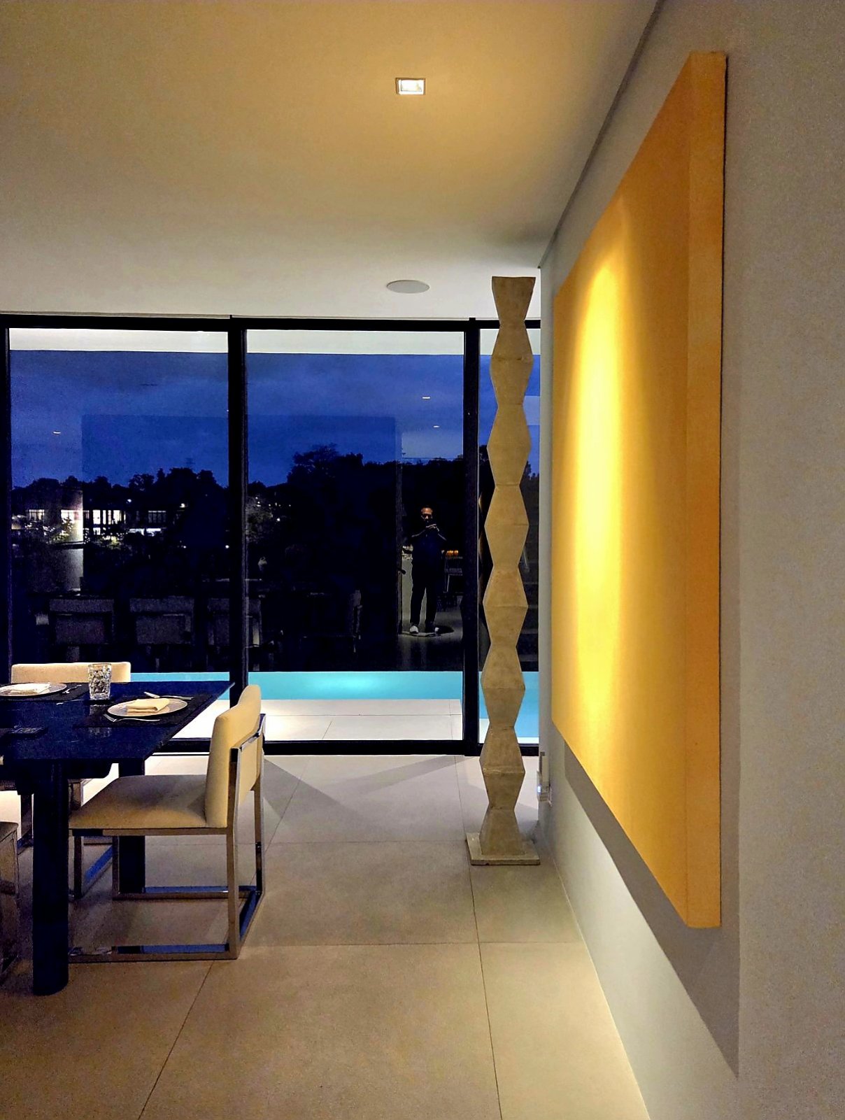 A contemporary dining area features a large, vibrant yellow abstract painting and a tall sculptural column reflect the owner’s aesthetic preferences.