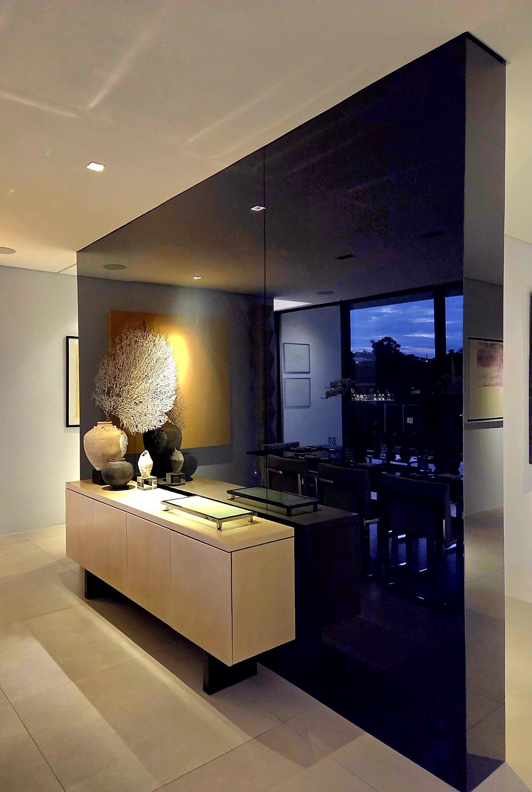 A large black glass wall divides spaces accompanied by an austere side board with art objects picked up from the couple’s extensive travels.